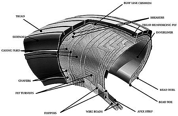 Bias ply tires have casings made from layers of 'plies' of parallel textile cords which run diagonally from bead to bead. The cords are arranged so that alternate layers are on the opposite hand and cross each other at an angle of between 70 and 80' to form a trellis like structure.